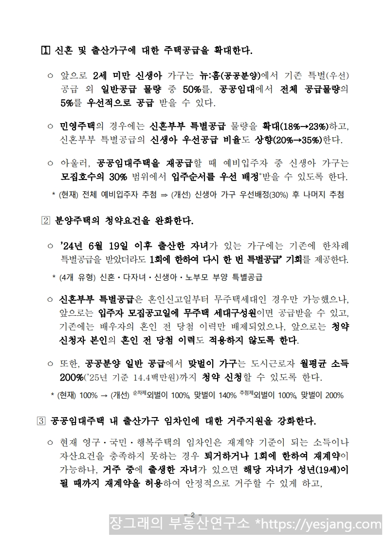 • 신혼부부 특별공급의 신생아 우선공급 비율 상향 (기존 20% → 개선 35%)