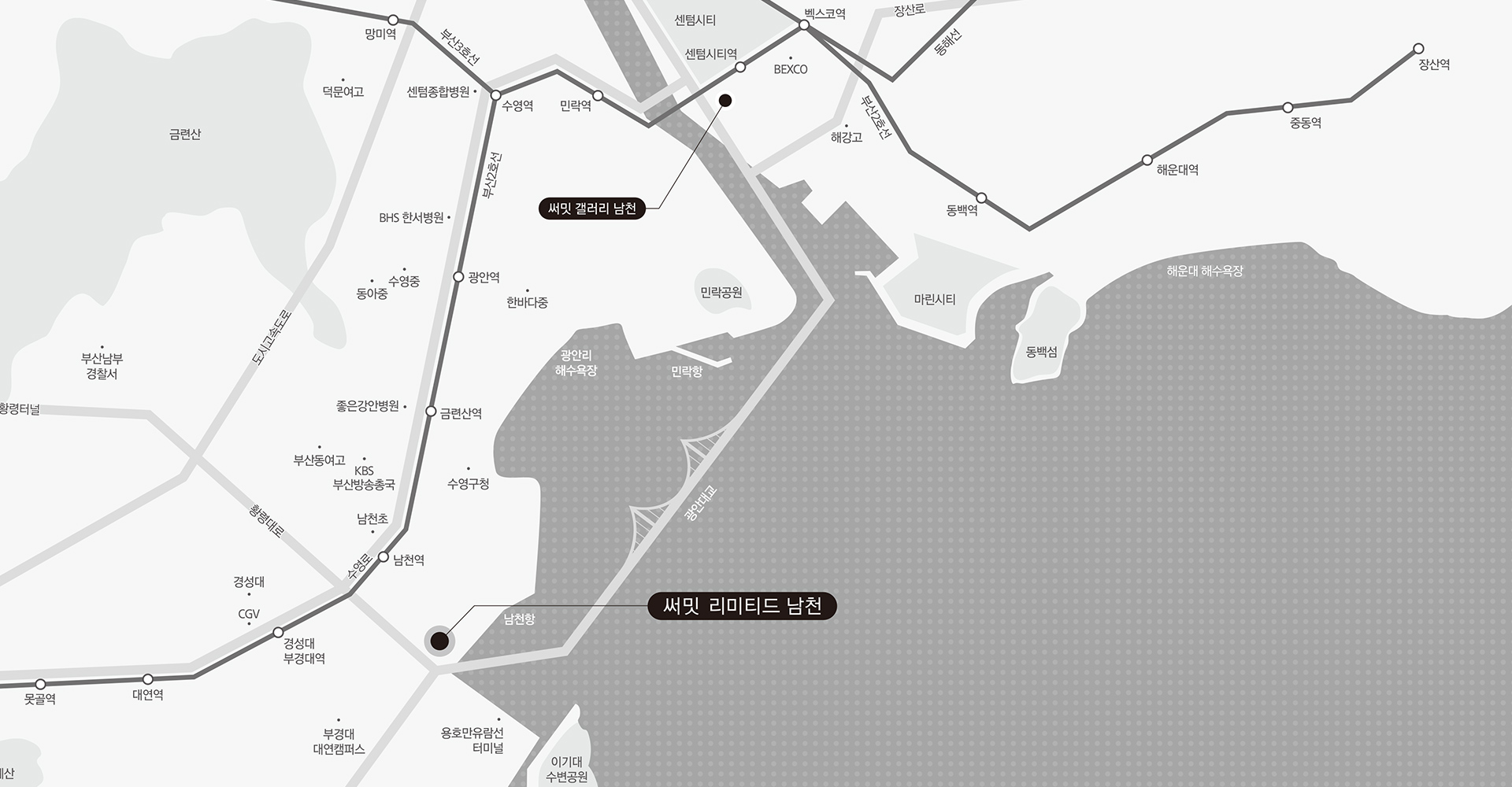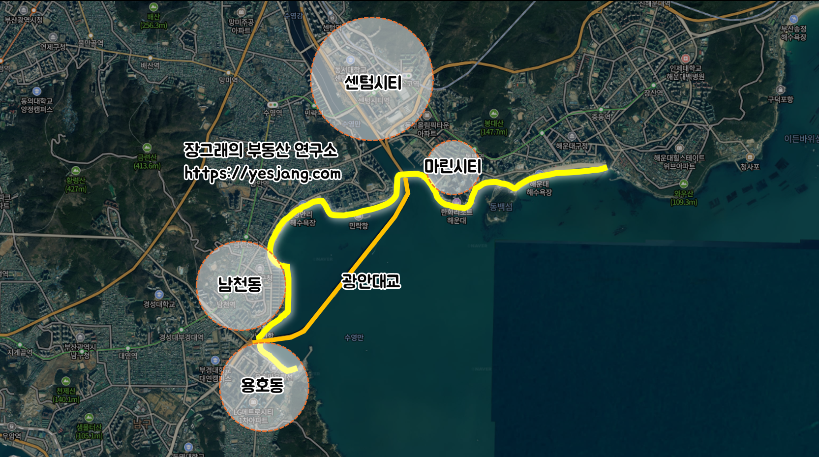 행정구역상으로는 남구이지만 남천동 바로 옆에 위치하고 광안대교 조망이 보이는