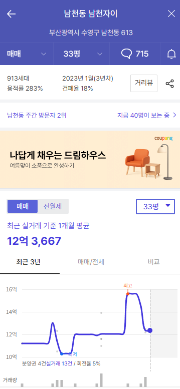그리고 남천동에 2023년도 입주를 마친 '남천자이'의 경우 국평기준 약 12억 3천만원으로 실거래를 보여주며